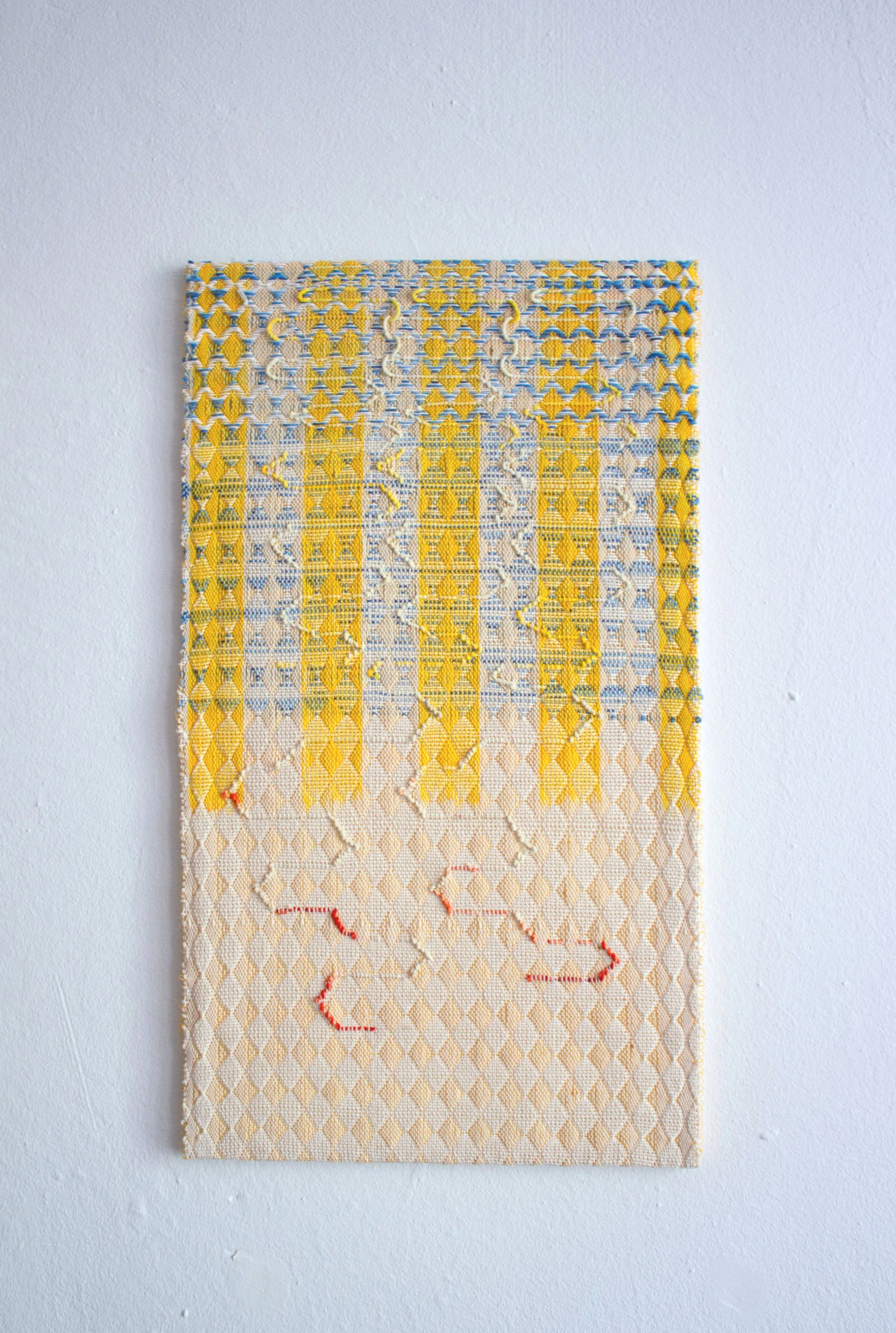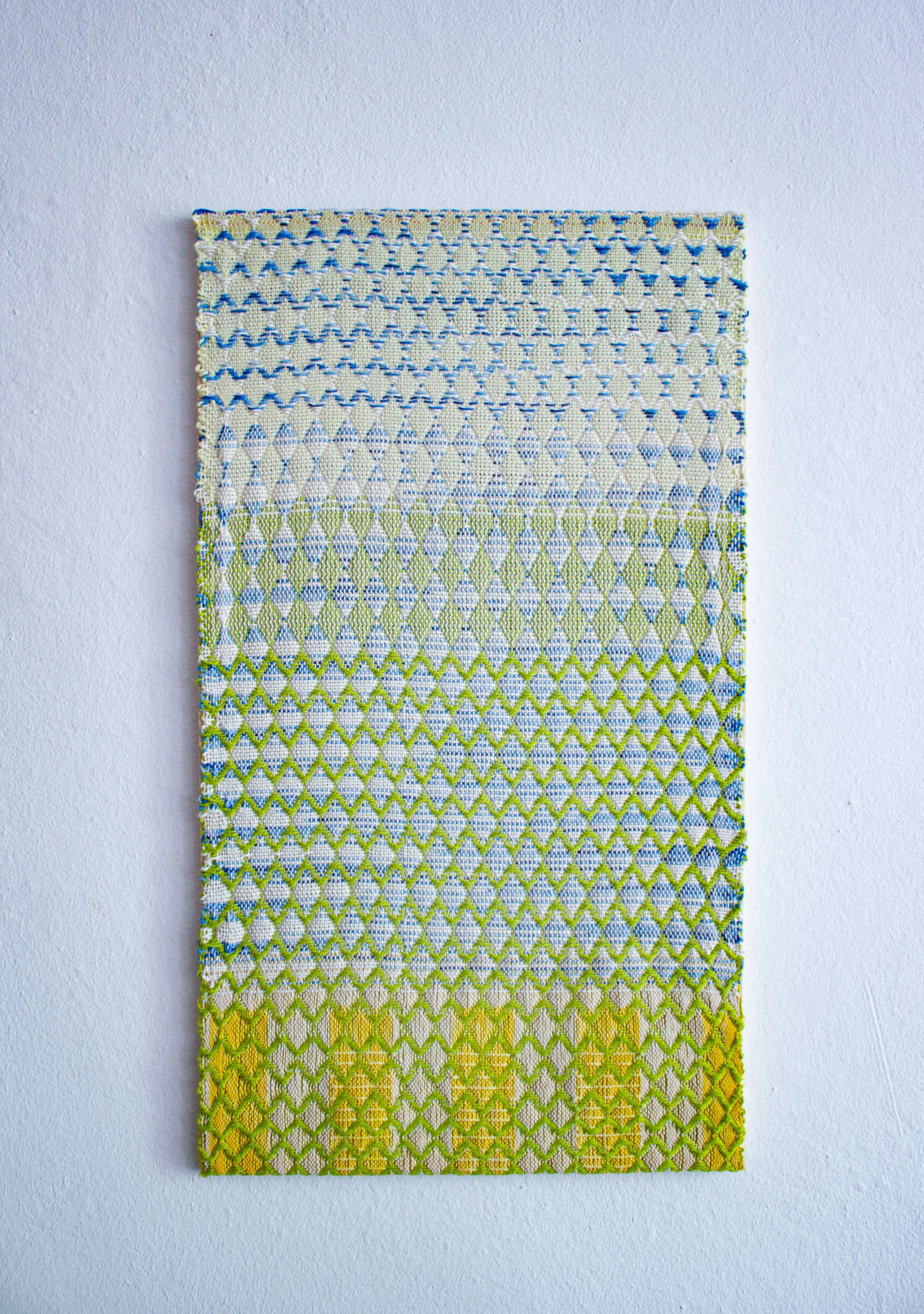Handwoven on eight shaft loom. Cotton warp, different materials weft.